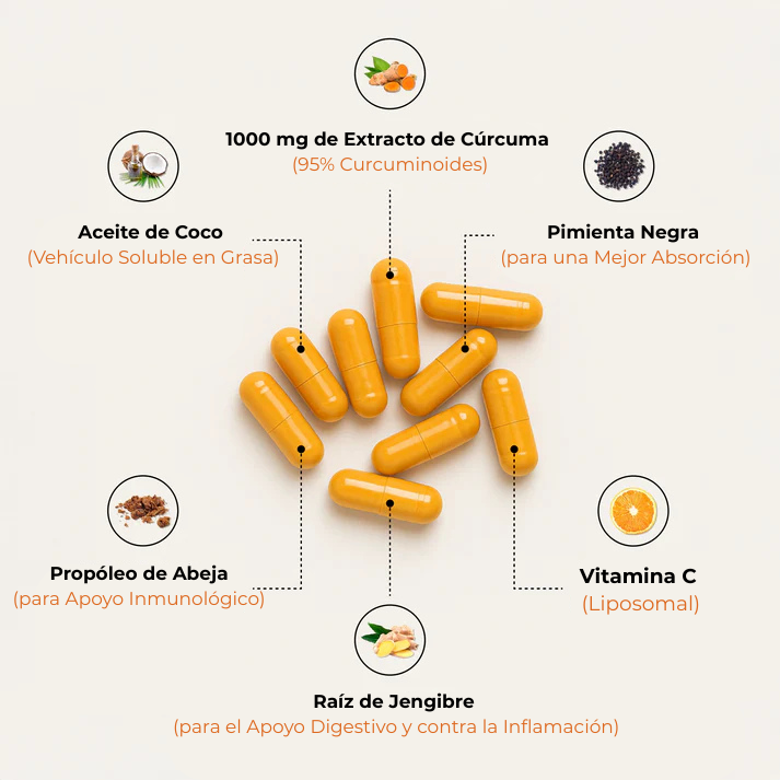 La curcumina se absorbe mal por sí sola. El extracto de pimienta negra aumenta la absorción hasta en un 2000 %, lo que ayuda al organismo a aprovechar al máximo cada dosis.